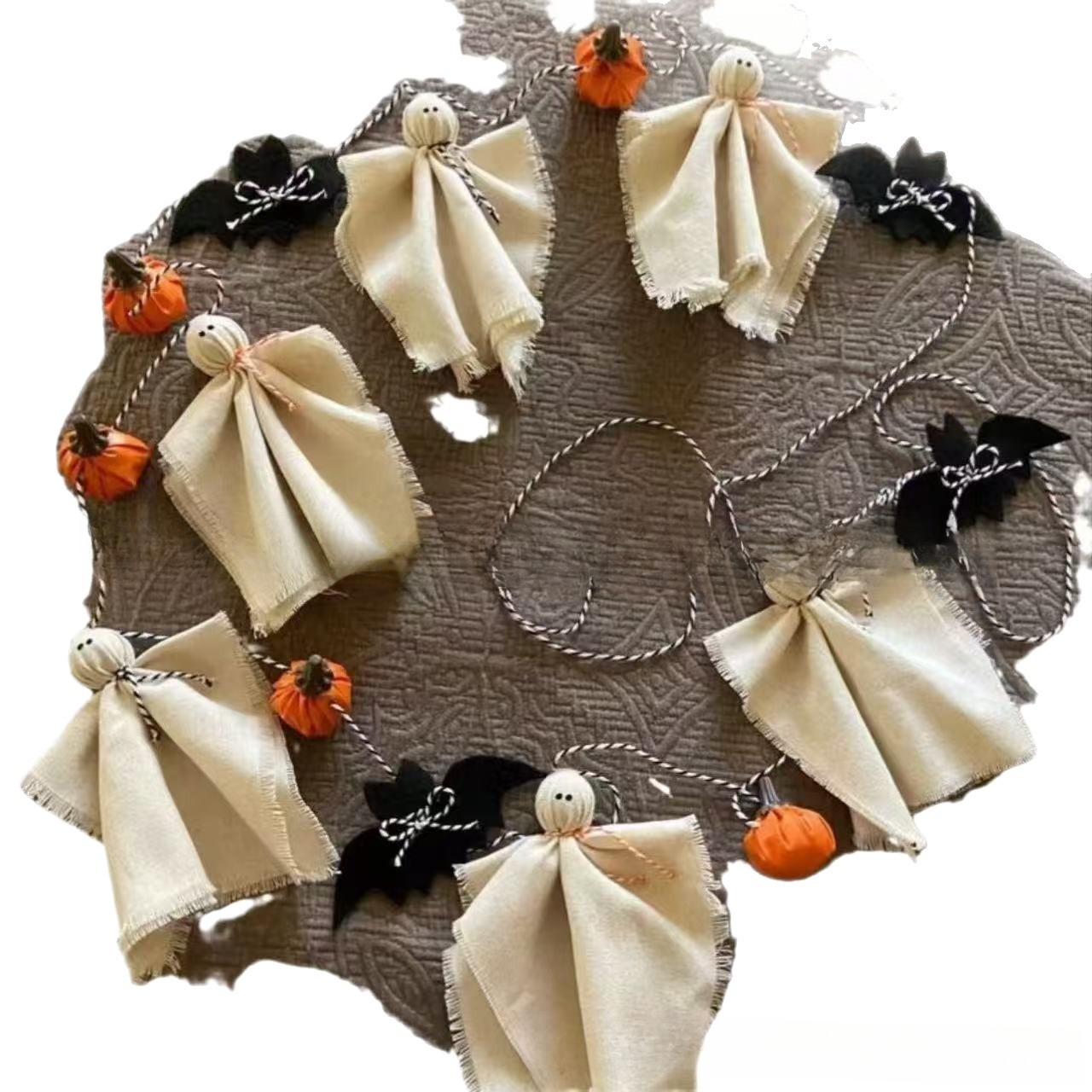 Handmade from soft cloth with embroidered details, these little ghost ornaments are perfect for creating a cozy yet eerie Halloween atmosphere. Hang them on walls, doors, or across your party space – they work beautifully as garlands or standalone pendants.